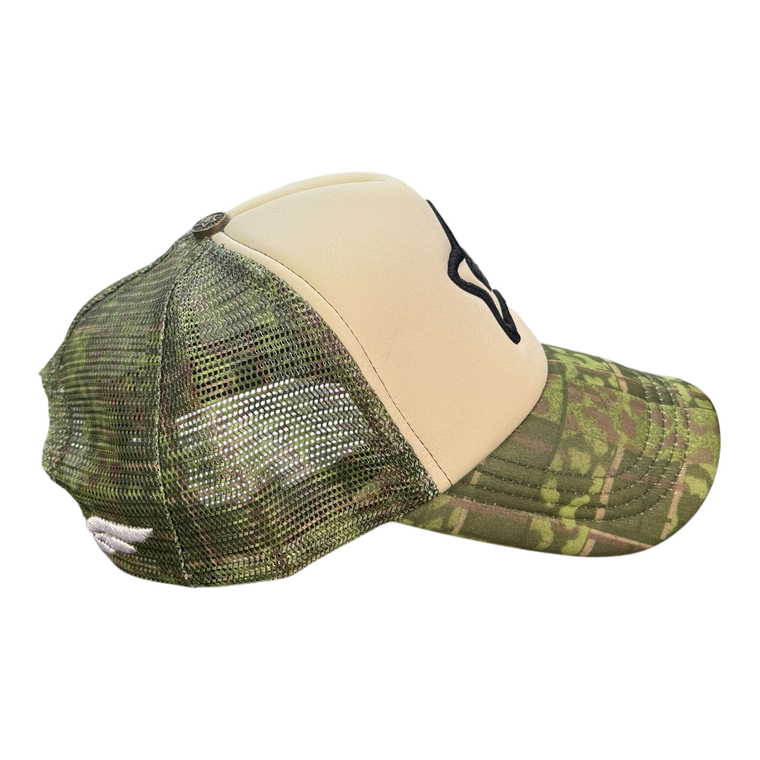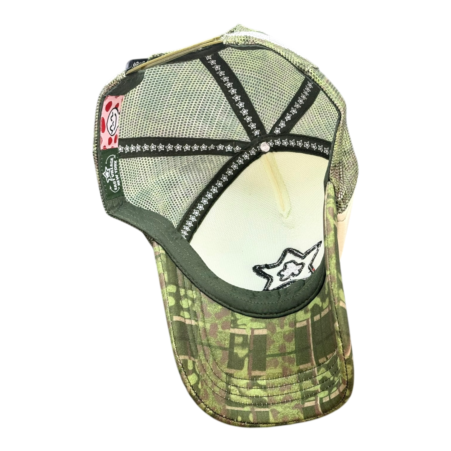 5-panel foam trucker cap with a soft front panel and mesh back for breathability. Features a curved visor with triple star embroidery and a high crown fit.