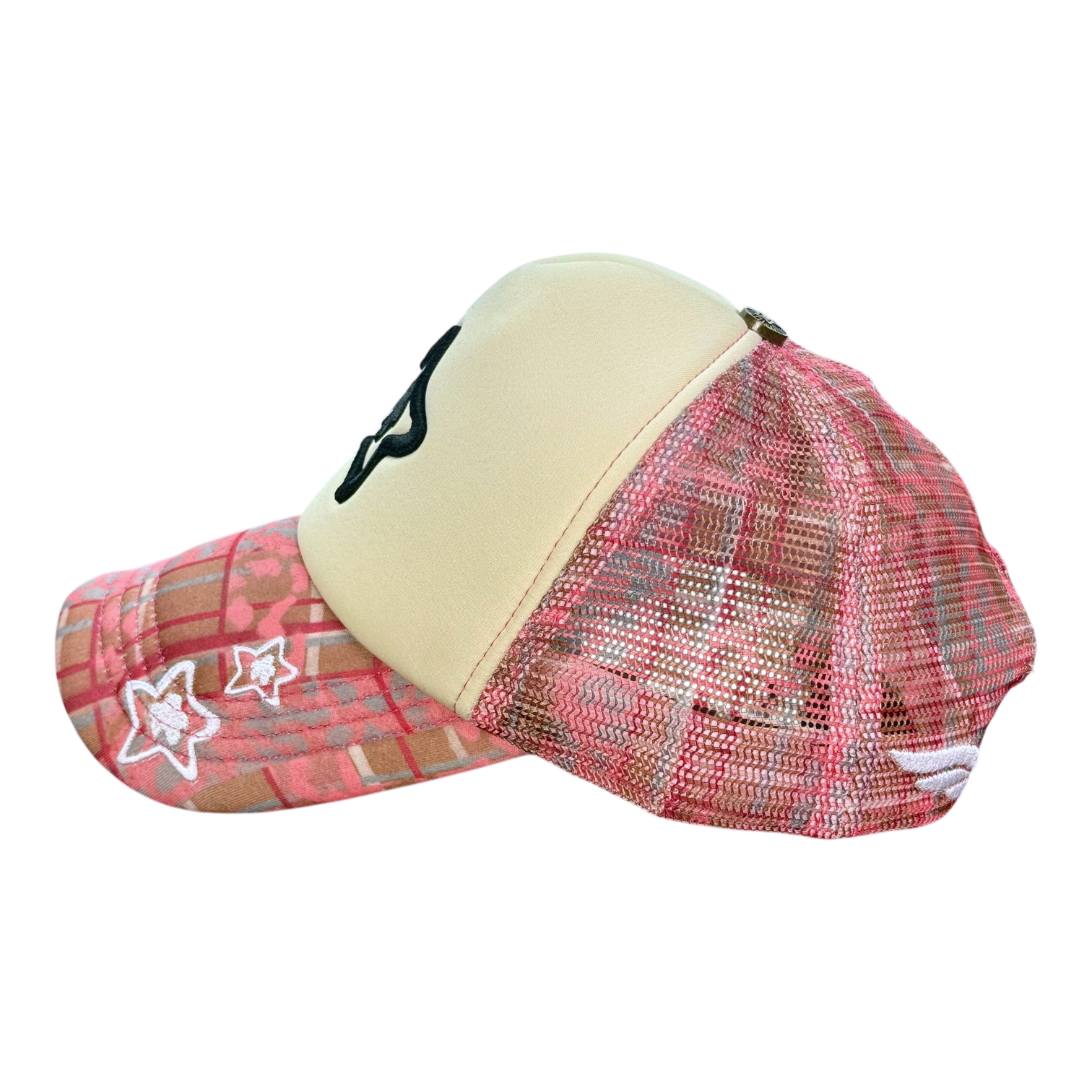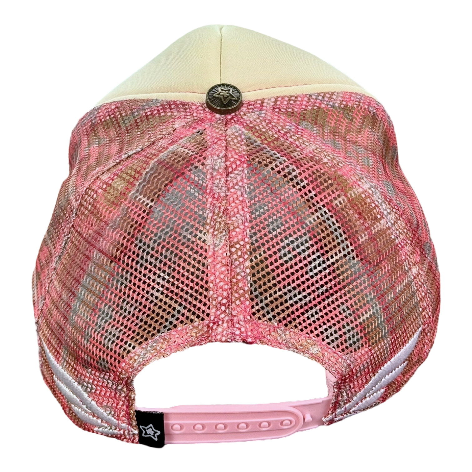 5-panel foam trucker cap with a soft front panel and mesh back for breathability. Features a curved visor with triple star embroidery and a high crown fit.